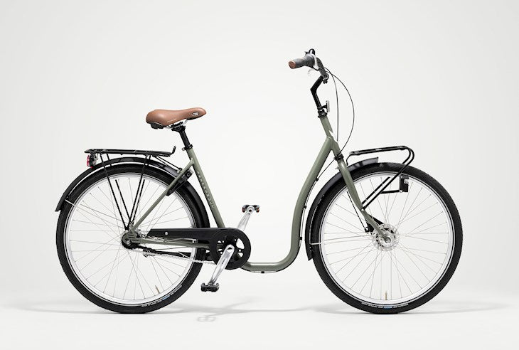 Den perfekta "dela-cykeln". Lång eller kort, ung eller gammal, den låga ramen gör det superenkelt att hoppa på och av cykeln. Perfekt för hela familjen, kollektivet, eller varför inte bostadsrättsföreningen. Eller om du vill ha en enda cykel i sommarhuset; här är den. Shimano Nexus, 7 växlar med fotbroms bak och rullbroms fram, lås och belysning. Pakehållare bak och fram med AVS-system (du kan sätta på alltifrån korgar till väskor). Den är bara att dela!